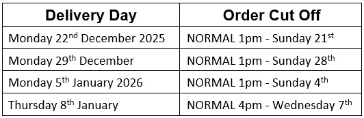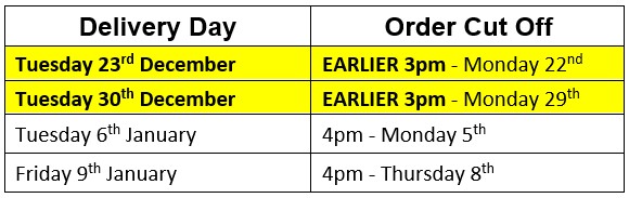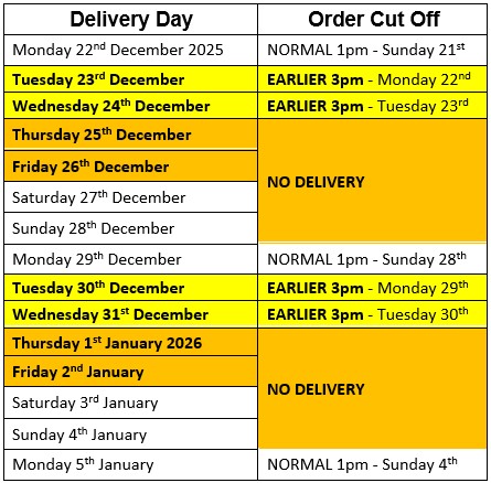 Whilst we are trading throughout the Christmas and New Year Period, it is highly recommended to order extra stock prior to the 24th of December as our manufacturing partners are working with skeleton staffing levels.