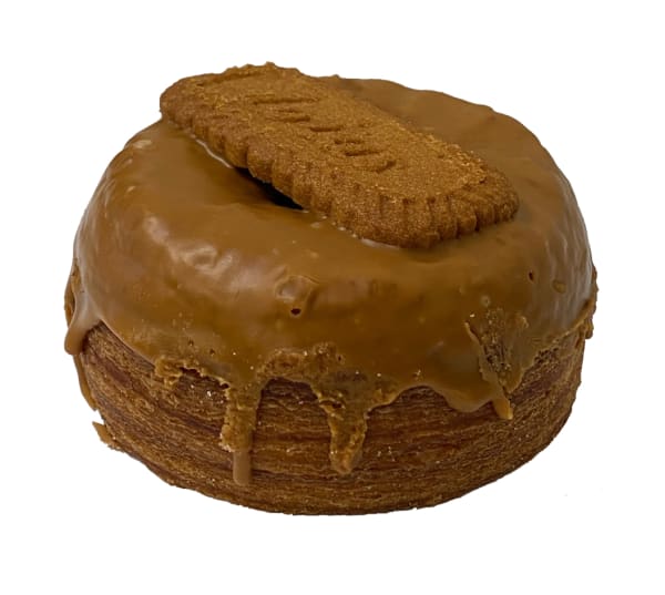 Delicious cronut with the most lovely texture of a croissant is intensified into a round crunchy, flaky delight. Covered with cinnamon spiced caramel glaze and finished with a cinnamon spiced Lotus Biscoff biscuit on top.