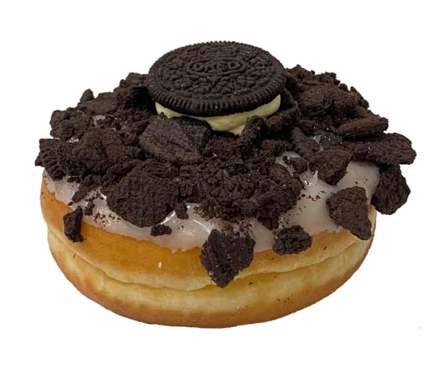 Light and fluffy donut filled with cream and featuring a glazed top covered with crushed oreo cookies. Topped with a dollop of cream and a oreo biscuit.