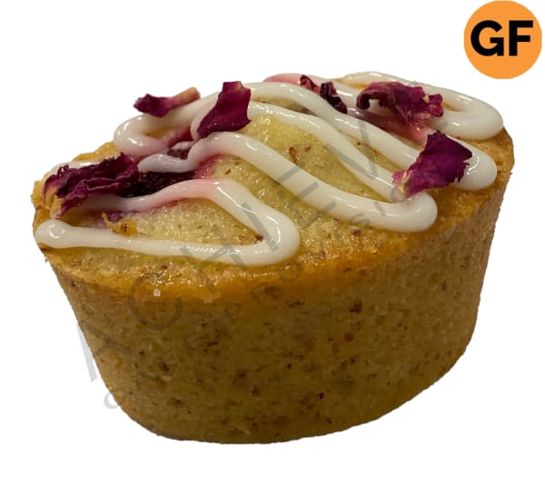 Sweet, soft almond friand with visible baked raspberries. Drizzled with lemon icing and sprinkled with dried edible rose petals.