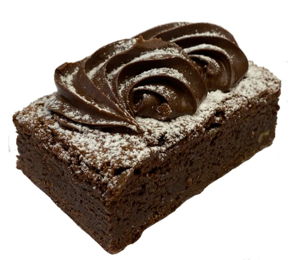 Triple choc brownie featuring its several points of chocolate with the brownie infused two types of chocolate to create a extra mud element. Plus garnished with chocolate ganish piped swirls and sprinkled over with icing sugar.