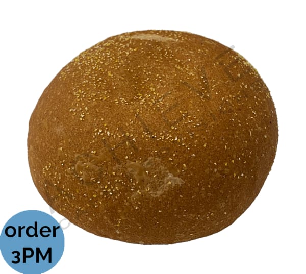 A soft round roll or bun made with rye and wheat flours, dusted with golden polenta.