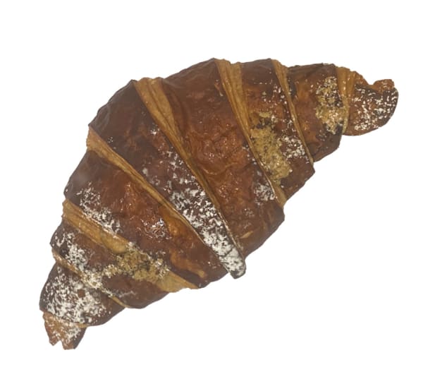 Wonderfully flaky chocolate croissant featuring layers and layer of pastry wrapped around a layer of chocolate. Topped with chocolate colour stripes and a delicate sprinkling of icing sugar.