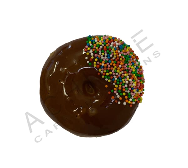 Small light and fluffy donut covered in chocolate icing and 100's & 1000's.