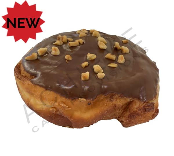 Classic donut dough rolled up into a scroll, featuring a generous serving of cinnamon sugar between each layer. Topped with choc hazelnut (nutella) spread and a sprinkling of chopped hazelnuts