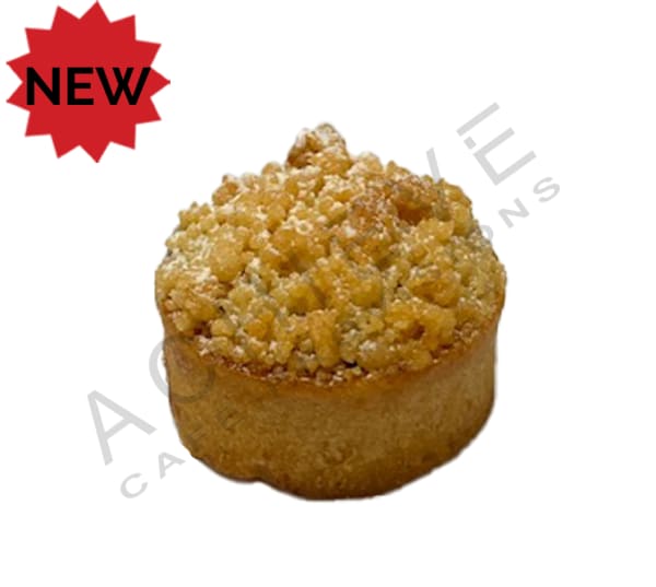 Tiny petite tart featuring apples and currants and topped with a buttery crumble all held within short crust pastry shell.