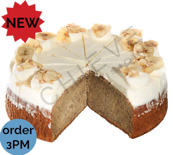 Made from fresh bananas and topped with cream cheese icing and dried banana chips. Pre-sliced into 12 pieces.