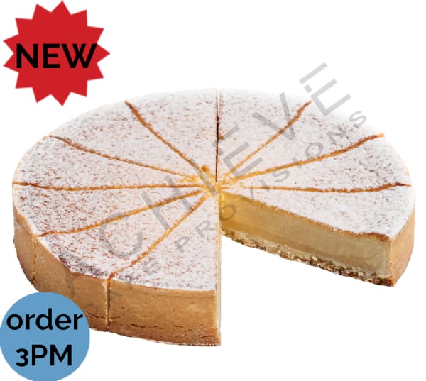 Slow baked baked lemony lime tart with butter shortbread base. Pre-sliced into 12 pieces.