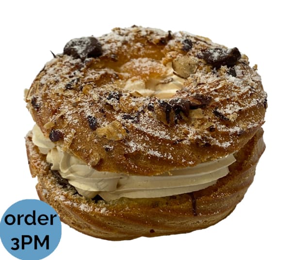 Two rings of choux pastry filled with hazelnut creme moussaline and nutella spread. Finished with dollops of nutella and sprinkling of icing sugar