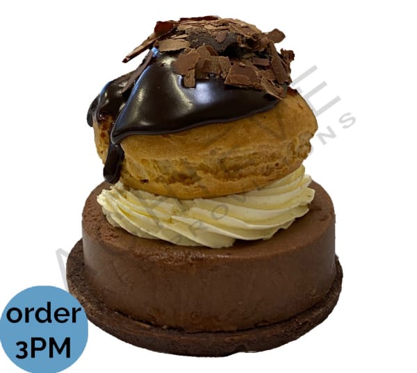 Smooth light chocolate mousse on a chocolate shortbread biscuit base, finished with fresh cream and a chocolate topped profiterole filled with vanilla custard.