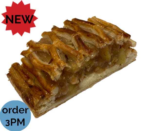 Golden, latticed, puff pastry wraps perfectly spiced mix of fresh apples and sultanas sitting on bed of light vanilla sponge cake.