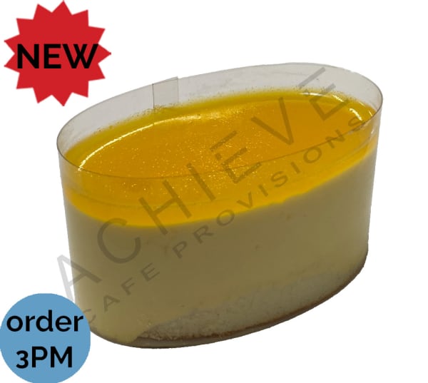 Light vanilla sponge base with mango mousse topped with mango compote.