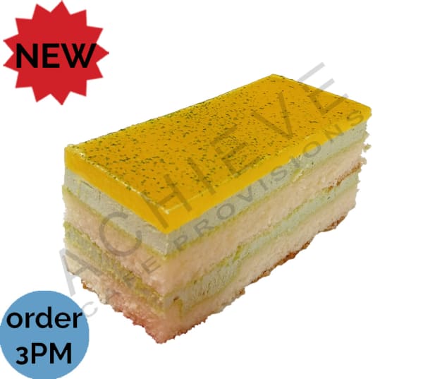 Delicious and refreshing cake with layers of sponge, topped with a matcha icing and filled with a mago puree.
