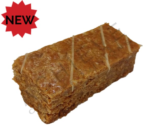 A crunchy maple flavoured granola slice drizzled with an orange gel.
