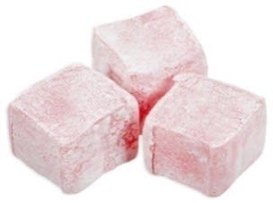Medium size cubes of traditional Turkish delight made from sweetened gelatin and rosewater, finished with a dusting of icing sugar