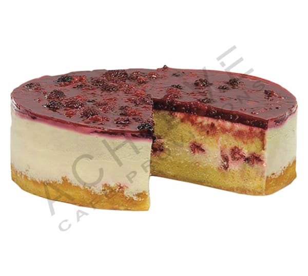 Layers of syrup soaked sponge filled with a creamy mousse & raspberries, topped with a berry compote jelly
