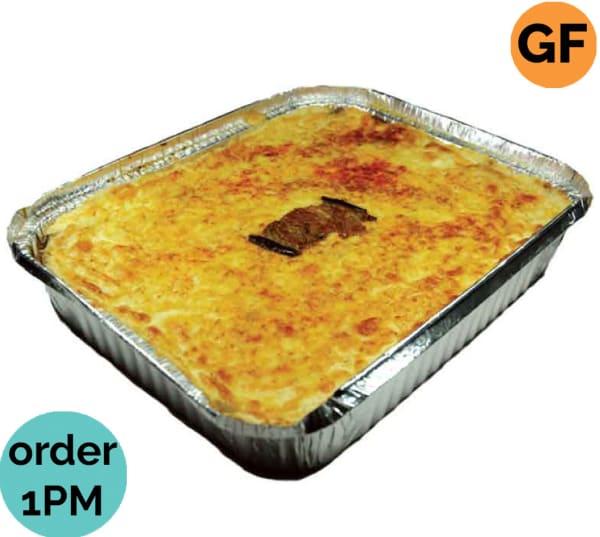 Classic Greek dish, a favourite in many homes, comprises of layers of eggplant, potatoes and beef topped with creamy béchamel sauce.