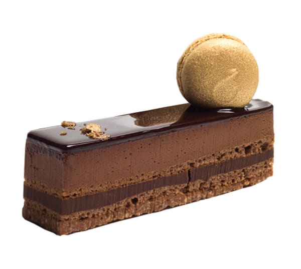 A rich Belgium 54% dark chocolate mousse, layered with cocoa Joconde biscuit and 70% Callebaut bitter ganache. Finished with chocolate mirror glaze.